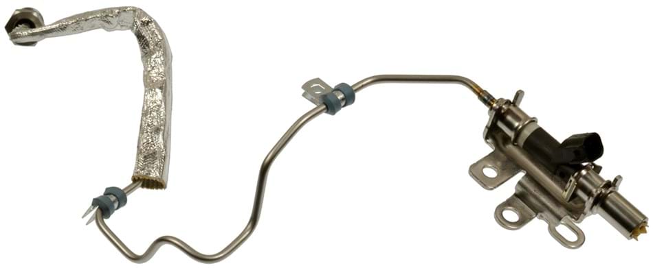 Indirect fuel injectors are located on the rear of the right cylinder head, with a line that connects to the exhaust down tube. The injectors transfer diesel fuel from the low-pressure side of the fuel pump to the high-pressure side, and spray diesel fuel directly into the exhaust system. The fuel then ignites in the exhaust and produces the heat required for the exhaust after the treatment regeneration process.
