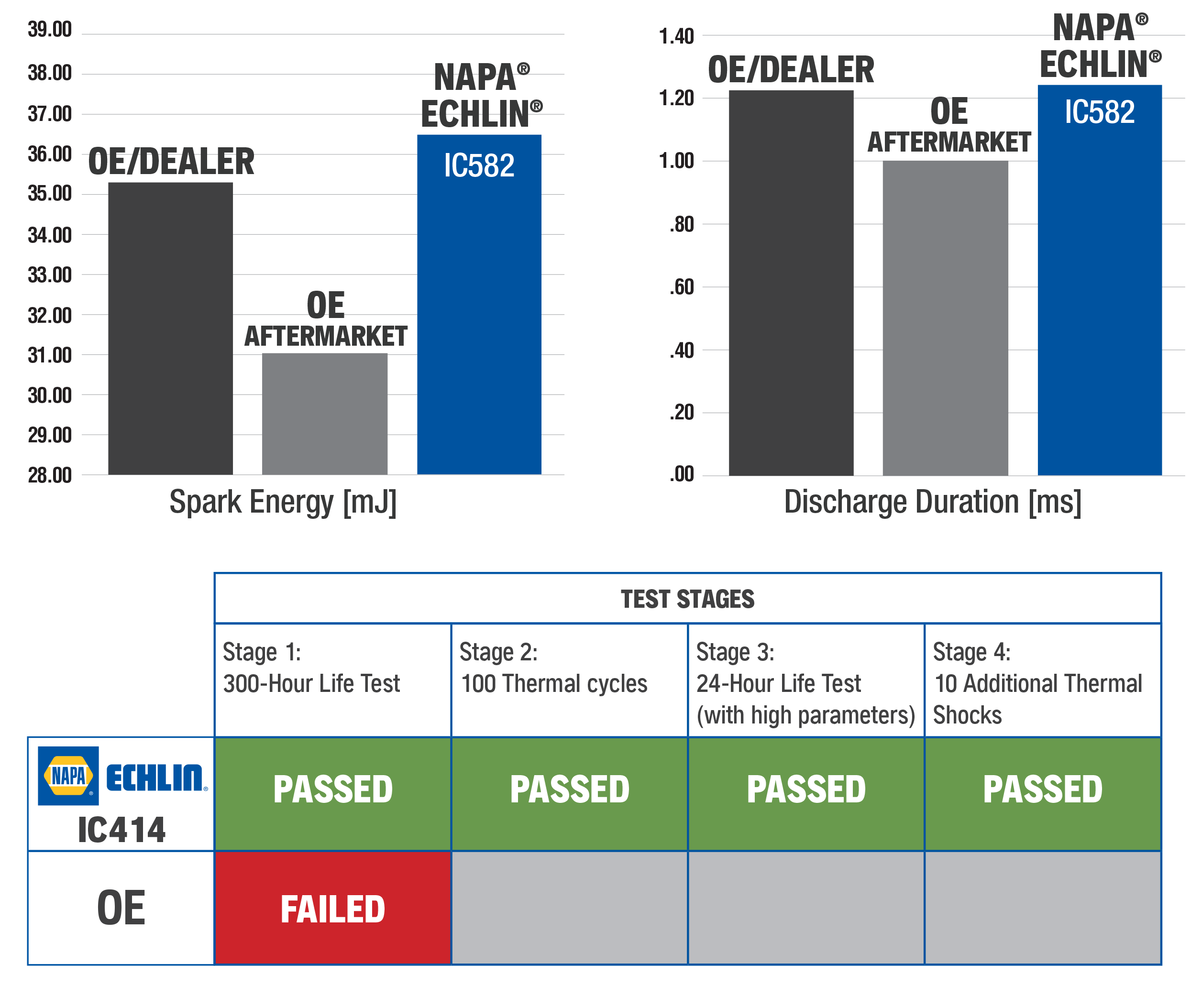 Test 2: The OE coils short-circuited and never completed Stage 1. NAPA® Echlin® coils passed 100 thermal cycles, a 24-hour life test, and 10 thermal shocks, producing more energy and higher secondary voltage for exceptional performance and durability.