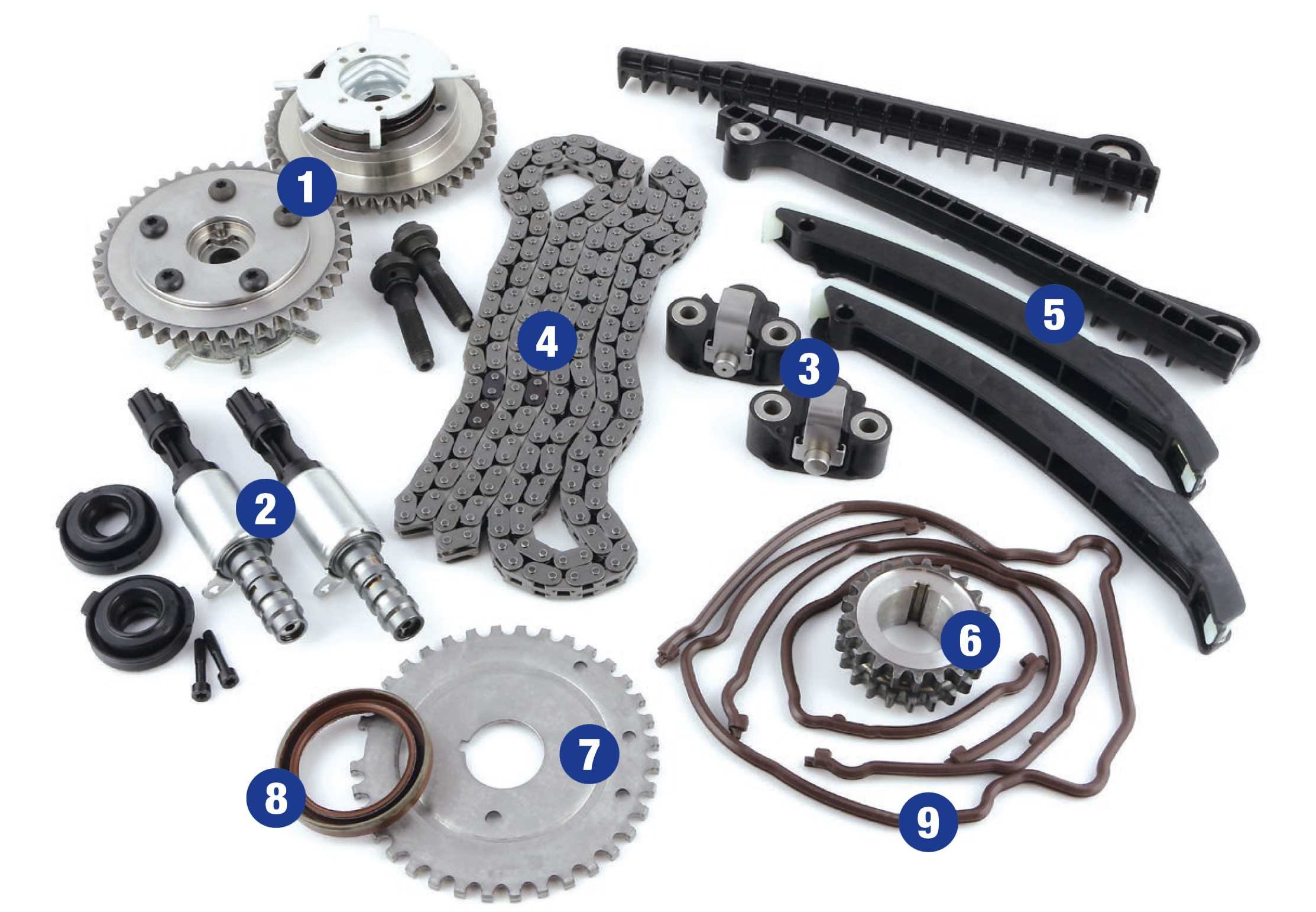 NAPA® Echlin® VVK1000 - Everything needed for a complete job – solenoids, sprockets, timing chain, guide, tensioner, arm, seals, crankshaft wheel, and gaskets.